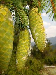 Keywords: pine cones green mountain tree organic agriculture outdoors environment trunk leaves branches nature woodland forest