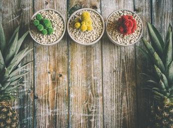 Keywords: pineapple desk wood table flat lay succulents terrarium plant fruit copy space cacti cactus colorful