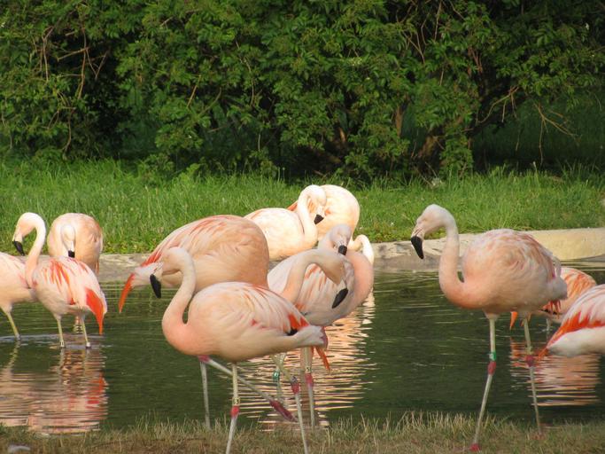 Keywords: pink flamingo flock bathing water tropical animals big wildlife exotic family community group nature outdoors wild park