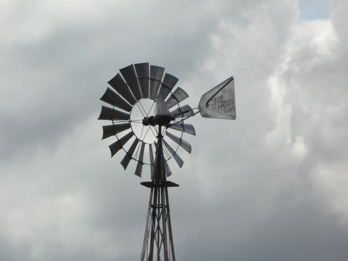 Keywords: pinwheel cloudy sky metal clouds water pump ranch