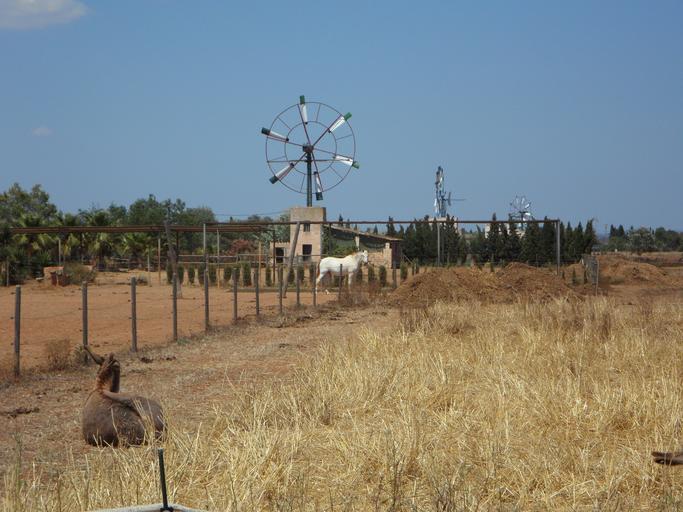 Keywords: pinwheel metal wheel wind wind energy energy blue sky landmark animals horses donkey animal husbandry pasture farm