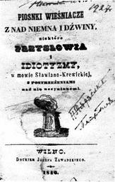 | Keywords: Piosnki wieśniacze znad Dźwiny. Wilno, 1840..jpg en Piosnki wieśniacze znad Dźwiny Wilno 1846 by Jan Czeczot be-tarask Вокладка кнігі ««Сялянскія песенькі з-пад ёмана і Дзьвіны некато ы п ыказкі на славяна-к ывіцкай мове і яе самабытныя словы з назі аньнямі над гэтай мовай»» 1846 году Яна Чачота Бела ускі кнігазбо Чачот Ян ВЫБРА ЫЯ ТВОРЫ / Уклад пе з польскага п адм і камент К Цві кі -- н Ф Бела ускі кнігазбо 1996 Jan Czeczot 1840 Jan Czeczot PD-old-100 | ||||