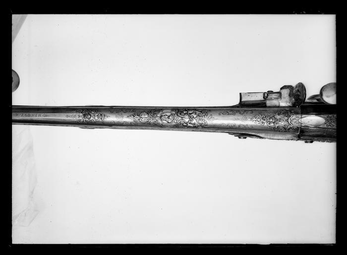 Keywords: Pipa flintlåsbössa - Livrustkammaren - 44349.tif Rund slätborrad pipa av stål med på kammaren snidade ornament i relief i tre grupper alla med punsad förgylld botten Längst bak bladrankor omgivande ett kvinnoansikte därframför bladrankor och slingor Svansskruvbladet helt förgyllt med skålformigt sikte bakåt avslutat med bladornament Från det sista reliefornamentet till kornet en tunn smal ribba utmed pipans ovansida därpå graverad signatur HENOVL På kammarens undersida stämpel C D <br/>Riktmedel Skålformigt sikte på svansskruvbladet Spolformigt förgyllt mässingskorn <br/>Fästning Tre häften två pipstift av stål Krysskruv underifrån delvis dold av varbygeln <br/><br/>Flintlås med plant låsbleck med fasade kanter samt snidad och graverad dekor Baktill en maskaron framför hanen en kerub omgiven av bladrankor amt nedtill signatur HENOVL Plan s-formig hane med lös överkäke och kulformig käkskruv med mittskåra och hög hals Batteri med bladornament och maskaron på eldstålsryggen Kantig fängpanna med fals Nöt studel och stången blånerade <br/>Fästning Två låsskruvar med graverade plana huvuden <br/><br/>Helstock av valnöt med kolv av fransk typ med snidad kantdekor Beslag av förgylld mässing med snidad reliefdekor Slät bakplåt med lång konturerad flik på kolvryggen på hälen en trofégrupp med maskaron krigarfigur med lagerkvist I övrigt blad- och rankdekor Tumplåt delvis genombruten med två mansfigurer samt oval medaljong med manshuvud i profil lika som på pipan Genombrutet sidbleck med rankor och fyra människofigurer de två i mitten barn sittande på bakåtseende liggande lejon de yttre knäböjande resp sittande fångar med bakbundna händer Varbygel med kort åttaformig främre arm avslutad med liljeliknande blad vid framstolpen en rembygel på bygeln bladdekor samt en trofégrupp Lång bakre arm med avslutning i form av vas och bladknippe Fyra profilerade rörkor på spetsrörkan en maskaron <br/><br/>Signeringen avser möjligen Francois Pholien H i Liège Grand armourier de sa Maiestè dePrusse eller sonen Philipp som 1721 planerar en vapenfabrik i Stettin De förgyllda mässingsbeslagen var populära i Preussen Enl Hellner avser signeringen Guillaume Henoul i Namur men dekoren är typisk för Liège enligt Hayward Jfr bössa SKO BB 404 nnr 12113 som enl SVHS medd 59 1959 anses vara av samma mästare signering GVILLEAM HENOVL A NAMVR <br/><br/>Tillbehör <br/>Laddstock av trä original caption pipa flintlåsbössa - LRK 10050 early other date century 18 walnut e3 - eldvapen - stock material valnöt - steel e12 - eldvapen - pipa och lås material stål - brass e47 - eldvapen - riktmedel och stockbeslag material mässing g 2750 size mm 1060 pipa size mm 1450 LRK Fredrik I av Sverige Paco Hårleman Överstelöjtnant Johan Magnus af Nordin Landshövding August Lundeberg brukspatron C D anv e1 - eldvapen - pipa; anonym pipsmed HENOVL anv e12 - eldvapen - pipa och lås; Francois Henouil Henoul HENOVL anv e12 - eldvapen - pipa och lås; Guillaume Henoul Henouil C D anv e1 - eldvapen - pipa; anonym pipsmed HENOVL anv e12 - eldvapen - pipa och lås; Francois Henouil Henoul HENOVL anv e12 - eldvapen - pipa och lås; Guillaume Henoul Henouil place of origin original filename LN_B12595_015475 45802 inventory number LRK 10050 44349 CC0 Pipa flintlåsbössa - Livrustkammaren - 44349-negative tif <gallery caption Different images of same object > File Halvbild flintlåsbössa - Livrustkammaren - 52910 tif File Helbild flintlåsbössa - Livrustkammaren - 27244 tif </gallery> Flintlock muskets images from Livrustkammaren Media contributed by LSH dim-with multiple size templates Media contributed by LSH unmatched creator Media contributed by LSH 2013-10 |
