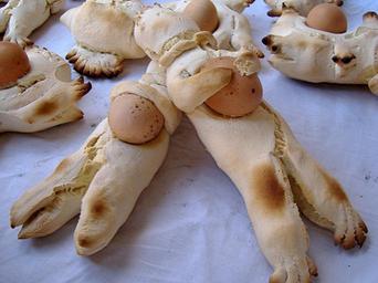 | Keywords: Pippia Cun S'Ou.jpg <b>Pippia Cun S'Ou</b> <br><i>Pane Pasquale</i> Bambolina di pane con un uovo in corrispondenza della pancia simbolo di buon auspicio e di maternità per le donne Giba Sardegna 2005-04-11 own assumed Funerea Giba Pane tradizionale della Sardegna Bread and Christianity Human-shaped breads Fertility in art Eggs in folk beliefs Boiled eggs |
