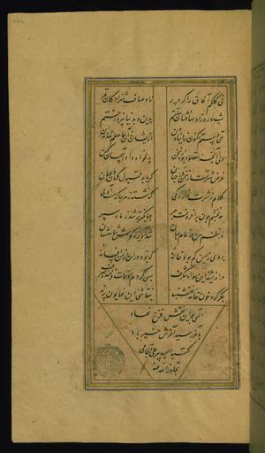| Keywords: Pir 'Ali al-Jami - Colophon - Walters W648166A - Full Page.jpg This folio from Walters manuscript W 648 contains a colophon in Arabic giving the name of the scribe only 10th century AH/AD 16th century Safavid ink pigments laid paper cm 23 5 14 accession number W 648 166A 81308 al-'abd Yar ibn Aq Muhammad 1019 AH/AD 1610-1611 mode of acquisition unknown seal impression on fol 166a Anonymous owner Rajab 1269 AH/AD 1853 mode of acquisition unknown seal impression on fol 4a Henry Walters Baltimore date and mode of acquisition unknown Walters Art Museum Henry Walters Acquired by Henry Walters Transliteration place of origin Iran Walters Art Museum license 2D Epic of Timur by Hatifi Walters MS 648 |