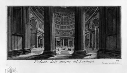 | Keywords: Piranesi-1024.jpg 1 1023 1025 XV Veduta dell'interno del Pantheon 53 8 x 41 4 cm it La veduta interna dello stesso tempio si dimostra nella detta Tavola alla fig II ove si nota l ™internamento degli orli delle basi delle colonne colla lett F Cfr Pianta di Roma disegnata colla situazione di tutti i Monumenti antichi num 79 Interior of Pantheon Rome in art Black and white drawings Etchings by Giovanni Battista Piranesi | ||||
