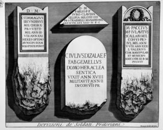 | Keywords: Piranesi-2054.jpg 2 2053 2055 LIII fr <br> à gauche D is M anibus / C aius Commagius / Secundinus / mil es c o hor tis X / pr aetoriae centuria Vetti / mil itavit ann os III / vix it ann os XXII / heres optimo / municipi suam / voluptate posuit CIL 06 2741 ; au centre en haut D is M anibus / --- P ublio Aelio P ubli f ilio / --- T auro Claudia / Cel l eia mil iti coh ortis IIII / pr aetoriae centuria Traebelli Maxsimi mil itavit / ann os II vix it ann os XXII h eres f aciendum c uravit 06 2522 ; au centre en bas C aius Iulius Dizalae f ilius / Fab ia Gemellus / domo Heraclea / Sentica / vixit ann os XVIII / militavit ann os II / in coh orte VII pr aetoria 06 2645 ; à droite M arcus Paccius / M arci f ilius Iul ia Avitus / Scallabi mil es / coh ortis VI pr aetoriae centuria / Iuli mil itavit ann os / V vix it ann os XXX / L ucius Valerius / commanipular is / et municeps / amico de se b ene m erenti posuit 06 2614 Ancient Roman inscriptions in Rome CIL VI 002741 CIL VI 002522 CIL VI 002645 CIL VI 002614 |