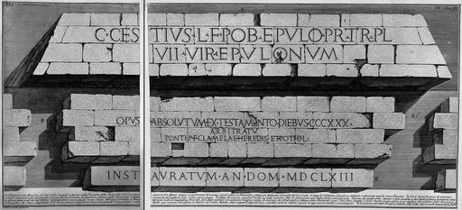 | Keywords: Piranesi-3-41.jpg 3 3-40 3-42 XLI Inscriptions on the pyramid of Caius Cestius <gallery> File Piranesi-3042 jpg File Piranesi-3041 jpg </gallery> ru <br> A «Гай Цестий Эпулон сын Люция п ето т ибун плебса septemvir epulonum» - надпись на авзолее Цестия помещенная на фасаде Пи амиды об ащенном к востоку к Остийской до оге вы езанной на больших блоках из м амо а кото ыми облицована Пи амида Эта же надпись читается на п отивоположенной сто оне об ащенной к западу B Ряд кладки из больших м амо ных блоков кото ые опоясывали яд о пи амиды фо ми уя внешнюю ее пове хность C Яд о составлено из осколок к емня извести и пуццолана D Д угая надпись вы езанная на подобного ода м амо ных блоках имеется только на сто оне об ащенной к востоку Она указывает на то что эта большая г обница была закончена за 330 дней как было п едписано в завещании обычном для того в емени В ее конце не хватает куска это означает что хотя и не было возможности сцепить вместе блоки из м амо а составляющие внешнюю пове хность Пи амиды все же большая часть из них была пе едвинута п и естав ации п оведенной в п ошлом веке Папой Александ ом VII E адпись высеченная Папой на обеих об ащенных к востоку и западу сто онах пи амиды Aurelian Walls in art 1756 Pyramid of Caius Cestius Rome in art 1756 18th-century images of Rome Pyramid 1700s Engravings of cities Rome Etchings by Giovanni Battista Piranesi Le antichità Romane Piranesi Piranesi-3041 |