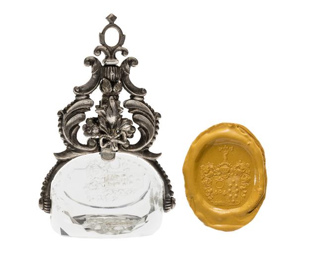 | Keywords: Pitschaft av silver och bergskristall med graverad vapensköld, 1700-tal - Hallwylska museet - 110334.tif LSH artwork sv Prisma av bergskristall tresidig med ovala sidor samt fasetterade ändar och kanter På en av sidorna graverat ett vapen avtryck se Planschverket på fyrsidig sköld med hjälmprydnad och lövverk Skaft platt triangulärt genombrutet och ciselerat nedtill en halvcirkelformig båge på vars utsida vid vardera ändan en uppåt doserande pärlstav däröver ett bladliknande utsprång; prismat rörligt i bågen på en tapp i vardera ändan Från bågen utgå två mot varandra snett uppresta S-formade sidostycken vartdera av två bågar den nedre större i form av ett akantusblad på ytterkanten med en pärlstav den övre mindre med inrullade ändar Mellan sidostyckena nedtill på en lång slät tapp en skjutbar hylsa med fjäder på vardera av hylsans sidor en pålagd blombukett ombunden med ett band knutet i en rosett med två öglor nedtill en slät klyka vilken griper över prismats uppåtvända kant; upptill en fyrbladigt blomkalk över denna en refflad knopp överst mellan två frånvända bågar en konturerad ögla med fasetterad knopp Etui original klätt med brunt kalvskinn varpå rika blom- och bladorneringar i guldtryck samt fodrat med röd sammet; vid främre ändan en hake av mässing med ögla original caption Pitschaft av silver och bergskristall med graverad vapensköld 1700-tal <br/> Nyckelord Föremålsbild Vapensköld Sigill Silver Pitschaft mid other date century 18 silver - quartz size cm 4 2 etui size cm 2 8 etui g 19 etui g 28 9 size cm 5 5 size cm 6 7 etui size cm 2 8 prisma size cm 2 3 HWY place of origin original filename hm_dig24382 16526 inventory number HWY XXXVIII I a 06 110334 CC-BY-SA Helena Bonnevier <gallery caption Different images of same object > File Etui till pitschaft 1700-tal - Hallwylska museet - 110479 tif </gallery> Heraldry Signets Silver Seals Accessories Helena Bonnevier Media contributed by LSH dim-with multiple size templates Media contributed by LSH 2016-12 |