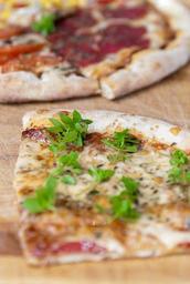 Keywords: pizza basil piece cake salami restaurant