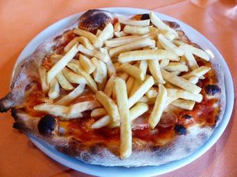Keywords: pizza chips pizza dinner delicious crust food eat french fries italian meal restaurant pizza topping plate lunch