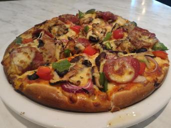 Keywords: pizza peppers food sauce cheese salami meal dinner crust vegetable delicious baked italian food fresh yellow sliced
