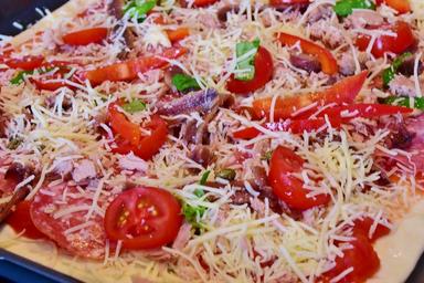 Keywords: pizza pizza topping crude tomatoes salami cheese dough italian food sausage cook piquant meal court lunch eat