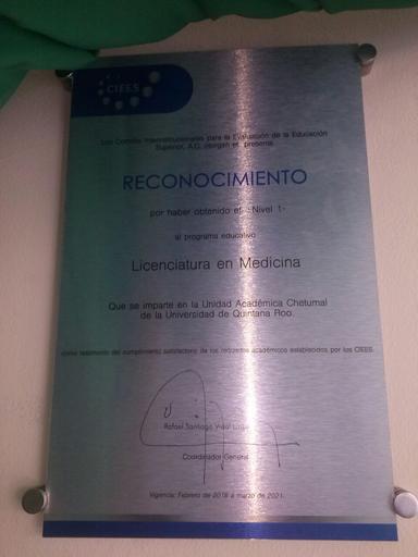 Keywords: Placa Medicina CIEES DCS UQROO.jpg es Placa conmemorativa de acreditación Nivel 1 otorgada a la carrera de Medicina de la División de Ciencias de la Salud Universidad de Quintana Roo por los Comités Interinstitucionales para la Evaluación de la Educación Superior A C CIEES en Commemorative plaque of Level 1 acreditation granted to the career of Medicine of the Division of Health Sciences University of Quintana Roo by the Inter-institutional Committees for Evaluation in Higher Education Civil association CIEES 2016-08-22 own Yucalpeten other versions 18 524039 -88 312989 cc-zero Plaques to be categorised by country |