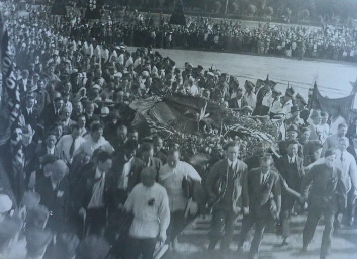 | Keywords: 20th century 20thcentury soviet union sovietunion boris souvarine borissouvarine russia commemoration demonstration petrograd saint-petersburg saintpetersburg field of mars fieldofmars february revolution februaryrevolution iind congress iindcongress third international thirdinternational communist international communistinternational comintern july 1920 july1920 iiird international iiirdinternational Boris Souvarine Papers - Soviet Russia Photos graduateinstitute.ch/home/research/library/archives/boris...  Notes: The « Square of the Victims of the Revolution » designates the Field of Mars, in Saint-Petersburg/Petrograd.  After the February Revolution in 1917, this area of the city became a memorial place, where participants killed during the Revolution were buried.  This picture probably shows a commemoration, which took place at the opening of the IInd Congress of the IIIrd International (17th July 1920). On this occasion, the delegates of the International came in procession to the Field of Mars, to pay a tribute to the victims. The procession may be carrying a symbolical coffin.  Unknown photographer.  Description: 1 photograph. Black and white ; 10 x 14 cm.  Sources and further reading:  Rosmer, Alfred. 1920. Moscou sous Lénine. Extract available online, "XIII: Smolny - Séance solennelle d'ouverture du IIe Congrès":  www.marxists.org/francais/rosmer/works/msl/msl2013.htm  Boris Souvarine Papers - Soviet Russia Photos graduateinstitute.ch/home/research/library/archives/boris...  Notes: The « Square of the Victims of the Revolution » designates the Field of Mars, in Saint-Petersburg/Petrograd.  After the February Revolution in 1917, this area of the city became a memorial place, where participants killed during the Revolution were buried.  This picture probably shows a commemoration, which took place at the opening of the IInd Congress of the IIIrd International (17th July 1920). On this occasion, the delegates of the International came in procession to the Field of Mars, to pay a tribute to the victims. The procession may be carrying a symbolical coffin.  Unknown photographer.  Description: 1 photograph. Black and white ; 10 x 14 cm.  Sources and further reading:  Rosmer, Alfred. 1920. Moscou sous Lénine. Extract available online, "XIII: Smolny - Séance solennelle d'ouverture du IIe Congrès":  www.marxists.org/francais/rosmer/works/msl/msl2013.htm   |