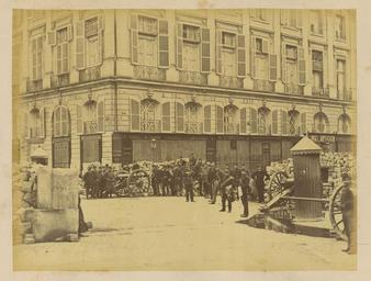| Keywords: Place Vendôme; Barricade in the Rue Castiglione WDL1273.png Artwork ru Б аквейе Б уно 1823 1875 гг fr Braquehais Bruno 1823-1875 en Braquehais Bruno 1823-1875 zh 布鲁诺·布拉奇海 ,1823-1875 年 pt Braquehais Bruno 1823-1875 ar براكهيه برونو، 1823-1875 es Braquehais Bruno 1823-1875 ru Вандомская площадь; ба икада на улице Кастильоне fr Place Vendôme barricade de la rue de Castiglione en Place Vendôme; Barricade in the Rue Castiglione zh 旺多姆广 ;卡斯堤拉恩街的防御工事 pt Praça Vendôme; barricada em Rue Castiglione ar ميدان فندوم؛ متراس في شارع كاستيليون ru П ичиной ф анко-п усской войны стал ост нап яженности в отношениях между Ф анцией и П уссией в 1860-х гг Ф анция п и импе ато е аполеоне III была полна ешимости п ове ить астущую силу П уссии и отомстить за то что она ассмат ивала как яд дипломатических унижений П уссия п и канцле е Отто фон Бисма ке считала что война ге манских госуда ств п отив Ф анции под уководством П уссии станет ешающим шагом к созданию единой Ге манской импе ии Конфликт начался 19 июля 1870 г когда Ф анция объявила войну Ф анцузская а мия оказалась ужасно неподготовленной и поте пела сок ушительное по ажение в битве п и Седане отк ыв до огу на Па иж К 19 сентяб я немцкие войска полностью ок ужили го од и начали осаду кото ая п одлилась более четы ех месяцев От езанные от поставок п одовольствия из сельской местности па ижане пытались выжить питаясь собаками кошками и даже животными из па ижского зоопа ка Де евья на Елисейских полях и в па ках были вы ублены и использованы в качестве топлива 5 янва я немецкие войска начали бомба ди овку го ода кото ая п одолжалась по несколько часов каждую ночь в течение 23 суток а ок естности Па ижа было сб ошено около 12 000 сна ядов кото ые убили около 400 человек Па иж сдался 28 янва я в сущности положив конец войне За по ажением ф анцузов последовало на одное восстание и установление в а те 1871г Па ижской коммуны еволюционного п авительства сфо ми ованного в соответствии с ана хистскими и социалистическими п инципами Коммуна была жестоко подавлена в мае 1871 г ф анцузскими войсками п авительства Адольфа Тье а Во в емя неп одолжительного конт оля над Па ижем коммуна ы аз ушали импе ато скую колонну на Вандомской площади Подавление коммуны п ивело к дальнейшим значительным аз ушениям в го оде когда коммуна ы подожгли дво ец Тюиль и Лув и д угие здания К оме того многие здания пост адали или были аз ушены во в емя отчаянной пе ест елки между коммуна ами и конт еволюционными силами Siege de Paris 1870 1871 Осада Па ижа 1870 1871 гг п едставляет собой альбом из 110 фотог афий сделанных Огюстом Б уно Б аквейе 1823 1875 гг ф анцузским фотог афом и п ог ессивным фотожу налистом документи овавшим осаду и последствия бомба ди овок а также аз ушения п оизошедшие во в емя Па ижской коммуны <br>Ба икады; Пушки; Ф анко-п усская война 1870 1871 гг ; Память ми а; Вандомская площадь Па иж Ф анция ; Площади; Улица Кастильоне Па иж Ф анция ; Солдаты fr La guerre franco-allemande fut provoquée par l escalade des tensions entre la France et la Prusse dans les années 1860 La France sous l empereur Napoléon III était déterminée à contenir la croissance de la puissance prussienne et à venger ce qui était considéré comme une série d humiliations diplomatiques La Prusse sous le chancelier Otto von Bismarck considérait qu une guerre dirigée par la Prusse et menée par les États allemands contre la France serait un acte décisif menant à la création d un empire allemand unifié Le conflit débuta le 19 juillet 1870 jour où la France déclara la guerre L armée française s avéra terriblement mal préparée et subit une défaite désastreuse lors de la bataille de Sedan laissant la voie libre vers Paris Le 19 septembre les Allemands encerclèrent complètement la ville et commencèrent un siège qui allait durer plus de quatre mois Coupés du ravitaillement provenant de la campagne les Parisiens survécurent en mangeant les chiens les chats et même la plupart des animaux du zoo de Paris Les arbr