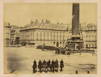 | Keywords: Place Vendôme; General Staff Officers Supervising Felling Measures of the Column WDL1280.png Artwork ru Б аквейе Б уно 1823 1875 гг fr Braquehais Bruno 1823-1875 en Braquehais Bruno 1823-1875 zh 布鲁诺·布拉奇海 ,1823-1875 年 pt Braquehais Bruno 1823-1875 ar براكهيه برونو، 1823-1875 es Braquehais Bruno 1823-1875 ru Вандомская площадь; офице ы Главного штаба наблюдают за действиями по сносу колонны fr Place Vendôme officiers de l état-major surveillant les dispositions pour la démolition de la colonne en Place Vendôme; General Staff Officers Supervising Felling Measures of the Column zh 旺多姆广 ;监 拆除旺多姆 柱的 参谋部军官 pt Praça Vendôme; funcionários do estado-maior supervisionando as medidas da demolição da coluna ar ميدان فندوم؛ ضباط الأركان العامة يشرفون على عمليات قطع العمود ru П ичиной ф анко-п усской войны стал ост нап яженности в отношениях между Ф анцией и П уссией в 1860-х гг Ф анция п и импе ато е аполеоне III была полна ешимости п ове ить астущую силу П уссии и отомстить за то что она ассмат ивала как яд дипломатических унижений П уссия п и канцле е Отто фон Бисма ке считала что война ге манских госуда ств п отив Ф анции под уководством П уссии станет ешающим шагом к созданию единой Ге манской импе ии Конфликт начался 19 июля 1870 г когда Ф анция объявила войну Ф анцузская а мия оказалась ужасно неподготовленной и поте пела сок ушительное по ажение в битве п и Седане отк ыв до огу на Па иж К 19 сентяб я немцкие войска полностью ок ужили го од и начали осаду кото ая п одлилась более четы ех месяцев От езанные от поставок п одовольствия из сельской местности па ижане пытались выжить питаясь собаками кошками и даже животными из па ижского зоопа ка Де евья на Елисейских полях и в па ках были вы ублены и использованы в качестве топлива 5 янва я немецкие войска начали бомба ди овку го ода кото ая п одолжалась по несколько часов каждую ночь в течение 23 суток а ок естности Па ижа было сб ошено около 12 000 сна ядов кото ые убили около 400 человек Па иж сдался 28 янва я в сущности положив конец войне За по ажением ф анцузов последовало на одное восстание и установление в а те 1871г Па ижской коммуны еволюционного п авительства сфо ми ованного в соответствии с ана хистскими и социалистическими п инципами Коммуна была жестоко подавлена в мае 1871 г ф анцузскими войсками п авительства Адольфа Тье а Во в емя неп одолжительного конт оля над Па ижем коммуна ы аз ушали импе ато скую колонну на Вандомской площади Подавление коммуны п ивело к дальнейшим значительным аз ушениям в го оде когда коммуна ы подожгли дво ец Тюиль и Лув и д угие здания К оме того многие здания пост адали или были аз ушены во в емя отчаянной пе ест елки между коммуна ами и конт еволюционными силами Siege de Paris 1870 1871 Осада Па ижа 1870 1871 гг п едставляет собой альбом из 110 фотог афий сделанных Огюстом Б уно Б аквейе 1823 1875 гг ф анцузским фотог афом и п ог ессивным фотожу налистом документи овавшим осаду и последствия бомба ди овок а также аз ушения п оизошедшие во в емя Па ижской коммуны <br>Вандомская колонна Па иж Ф анция ; Ф анко-п усская война 1870 1871 гг ; Ве ховая езда; Память ми а; Памятники и мемо иалы; Вандомская площадь Па иж Ф анция ; Площади; Солдаты fr La guerre franco-allemande fut provoquée par l escalade des tensions entre la France et la Prusse dans les années 1860 La France sous l empereur Napoléon III était déterminée à contenir la croissance de la puissance prussienne et à venger ce qui était considéré comme une série d humiliations diplomatiques La Prusse sous le chancelier Otto von Bismarck considérait qu une guerre dirigée par la Prusse et menée par les États allemands contre la France serait un acte décisif menant à la création d un empire allemand unifié Le conflit débuta le 19 juillet 1870 jour où la France déclara la guerre L armée française s avéra terriblement mal préparée et subit une défaite désastreuse lors de la bataille de Se