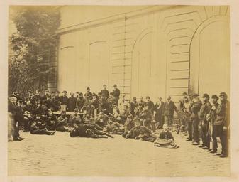 | Keywords: Place Vendôme, Ministry of Justice Courtyard. (Supper Time) WDL1275.png Artwork ru Б аквейе Б уно 1823 1875 гг fr Braquehais Bruno 1823-1875 en Braquehais Bruno 1823-1875 zh 布鲁诺·布拉奇海 ,1823-1875 年 pt Braquehais Bruno 1823-1875 ar براكهيه برونو، 1823-1875 es Braquehais Bruno 1823-1875 ru Вандомская площадь дво инисте ства юстиции В емя ужина fr Place Vendôme cour du ministère de la Justice L heure de la soupe en Place Vendôme Ministry of Justice Courtyard Supper Time zh 旺多姆广 ,司法部的庭院 (晚餐时间) pt Praça Vendôme pátio do Ministério da Justiça hora do jantar ar ميدان فندوم، فناء وزارة العدل وقت العشاء ru П ичиной ф анко-п усской войны стал ост нап яженности в отношениях между Ф анцией и П уссией в 1860-х гг Ф анция п и импе ато е аполеоне III была полна ешимости п ове ить астущую силу П уссии и отомстить за то что она ассмат ивала как яд дипломатических унижений П уссия п и канцле е Отто фон Бисма ке считала что война ге манских госуда ств п отив Ф анции под уководством П уссии станет ешающим шагом к созданию единой Ге манской импе ии Конфликт начался 19 июля 1870 г когда Ф анция объявила войну Ф анцузская а мия оказалась ужасно неподготовленной и поте пела сок ушительное по ажение в битве п и Седане отк ыв до огу на Па иж К 19 сентяб я немцкие войска полностью ок ужили го од и начали осаду кото ая п одлилась более четы ех месяцев От езанные от поставок п одовольствия из сельской местности па ижане пытались выжить питаясь собаками кошками и даже животными из па ижского зоопа ка Де евья на Елисейских полях и в па ках были вы ублены и использованы в качестве топлива 5 янва я немецкие войска начали бомба ди овку го ода кото ая п одолжалась по несколько часов каждую ночь в течение 23 суток а ок естности Па ижа было сб ошено около 12 000 сна ядов кото ые убили около 400 человек Па иж сдался 28 янва я в сущности положив конец войне За по ажением ф анцузов последовало на одное восстание и установление в а те 1871г Па ижской коммуны еволюционного п авительства сфо ми ованного в соответствии с ана хистскими и социалистическими п инципами Коммуна была жестоко подавлена в мае 1871 г ф анцузскими войсками п авительства Адольфа Тье а Во в емя неп одолжительного конт оля над Па ижем коммуна ы аз ушали импе ато скую колонну на Вандомской площади Подавление коммуны п ивело к дальнейшим значительным аз ушениям в го оде когда коммуна ы подожгли дво ец Тюиль и Лув и д угие здания К оме того многие здания пост адали или были аз ушены во в емя отчаянной пе ест елки между коммуна ами и конт еволюционными силами Siege de Paris 1870 1871 Осада Па ижа 1870 1871 гг п едставляет собой альбом из 110 фотог афий сделанных Огюстом Б уно Б аквейе 1823 1875 гг ф анцузским фотог афом и п ог ессивным фотожу налистом документи овавшим осаду и последствия бомба ди овок а также аз ушения п оизошедшие во в емя Па ижской коммуны <br>Дво ы; Обед; Ф анко-п усская война 1870 1871 гг ; Г упповые по т еты; Память ми а; Вандомская площадь Па иж Ф анция ; По т етные фотог афии; Солдаты fr La guerre franco-allemande fut provoquée par l escalade des tensions entre la France et la Prusse dans les années 1860 La France sous l empereur Napoléon III était déterminée à contenir la croissance de la puissance prussienne et à venger ce qui était considéré comme une série d humiliations diplomatiques La Prusse sous le chancelier Otto von Bismarck considérait qu une guerre dirigée par la Prusse et menée par les États allemands contre la France serait un acte décisif menant à la création d un empire allemand unifié Le conflit débuta le 19 juillet 1870 jour où la France déclara la guerre L armée française s avéra terriblement mal préparée et subit une défaite désastreuse lors de la bataille de Sedan laissant la voie libre vers Paris Le 19 septembre les Allemands encerclèrent complètement la ville et commencèrent un siège qui allait durer plus de quatre mois Coupés du ravitaillement provenant de la campagne les Parisiens survécurent en mangeant les chiens