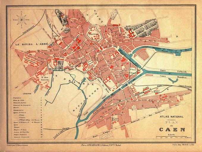 | Keywords: Plan 1890environ.jpg Plan de Caen à la Belle-Epoque Propriété personnelle 1896 F de la Brugère in Atlas National Fayard et Fils Paris 1896 PD-old Old maps of Caen 19th century 1890 Caen in the 1890s ImageNote 1 435 469 104 106 1682 1267 2 Lycée Malherbe fondé en 1804 et installé dans l'Abbaye aux Hommes ImageNoteEnd 1 ImageNote 2 273 524 161 232 1682 1267 2 Bon Sauveur hôpital psychiatrique fondé à Vaucelle au XVIII e et transféré au début du XIX e dans l'ancien couvent des Capucins ImageNoteEnd 2 ImageNote 3 158 443 192 131 1682 1267 2 Quartier Lorge base militaire aménagée à partir de 1792 dans l'ancien monastère de la Visitation de Caen et agrandi au XIX e ImageNoteEnd 3 ImageNote 4 554 680 315 306 1682 1267 2 Hippodrome de la Prairie champs de course ouvert dans les années 1830 ImageNoteEnd 4 ImageNote 5 1179 718 93 74 1682 1267 2 Gare de Caen gare ouverte en 1857 sur la ligne Paris-Caen prolongée jusqu'à Cherbourg en 1858 ImageNoteEnd 5 ImageNote 6 907 695 89 70 1682 1267 2 Caserne Hamelin construite dans la deuxième partie du XVIII e ImageNoteEnd 6 ImageNote 7 835 631 150 116 1682 1267 2 Hospice Saint-Louis ancien Hôpital général fondé au milieu du XVII e ImageNoteEnd 7 ImageNote 8 1057 141 283 194 1682 1267 2 Hôtel-Dieu transféré en 1823 dans l'ancienne abbaye aux Dames ImageNoteEnd 8 ImageNote 9 478 294 30 23 1682 1267 2 Gare de Caen Saint-Martin à l'origine simple embarcadère servant de tête de ligne de Caen à la mer Le bâtiment voyageurs est construit en 1884 ImageNoteEnd 9 ImageNote 10 513 431 57 46 1682 1267 2 Palais de justice de Caen construit dans la première partie du XIX e à partir de plans dressés par Armand Lefebvre ingénieur des ponts et chaussées de la généralité de Caen en 1779 ImageNoteEnd 10 ImageNote 11 378 484 63 53 1682 1267 2 Monastère des Visitandines installé dans l'ancien logis abbatial de l'abbaye aux Hommes à partir de 1810 ImageNoteEnd 11 ImageNote 12 670 547 57 53 1682 1267 2 Hôtel de la Préfecture construit dans la première partie du XIX e ImageNoteEnd 12 ImageNote 13 448 321 89 63 1682 1267 2 Académie d'équitation école de dressage fondée en 1728 par Pierre des Brosses de La Guérinière reconstruite par Gustave Auvray de 1863 à 1866 ImageNoteEnd 13 ImageNote 14 756 562 30 25 1682 1267 2 Théâtre de Caen construit en 1838 et rénové en 1879 ImageNoteEnd 14 ImageNote 15 680 511 66 65 1682 1267 2 Ancien séminaire des Eudistes dans lequel sont installés l'hôtel de ville le musée-école des Beaux-Arts la bibliothèque et l'hôtel des postes ImageNoteEnd 15 ImageNote 16 1065 697 82 87 1682 1267 2 Abattoirs construits en 1855 pour remplacer la halle de la boucherie située en centre-ville ImageNoteEnd 16 ImageNote 17 900 781 38 36 1682 1267 2 Barrage-passerelle barrage à aiguilles mobiles système Poirée construit en 1873-1874 ImageNoteEnd 17 ImageNote 18 989 720 40 32 1682 1267 2 Pont de Vaucelle ancien pont Frileux reconstruit en 1825 ImageNoteEnd 18 ImageNote 19 1050 684 32 27 1682 1267 2 Pont des Abattoirs pont ferroviaire construit en 1857 pour relier la gare au port de Caen bassin Saint-Pierre ouvert à la circulation générale après la construction d'un nouveau pont ferroviaire en 1873 ImageNoteEnd 19 ImageNote 20 1073 669 36 30 1682 1267 2 Pont ferroviaire construit en 1873 pour relier la gare au port de Caen bassin Saint-Pierre ImageNoteEnd 20 ImageNote 21 1084 862 63 61 1682 1267 2 Cimetière Saint-Jean aménagé dans une ancienne carrière à partir de la fin du XVIII e pour accueillir les morts de la paroisse Saint-Jean ImageNoteEnd 21 ImageNote 22 1314 777 89 51 1682 1267 2 Usine à gaz ImageNoteEnd 22 ImageNote 23 809 1079 148 89 1682 1267 2 Cimetière de Vaucelles agrandi à la fin du XIX e ImageNoteEnd 23 ImageNote 24 1236 828 61 38 1682 1267 2 Couvent des Capucins aménagé dans les anciens locaux du Bon Sauveur ImageNoteEnd 24 ImageNote 25 898 422 106 76 1682 1267 2 Couvent de la Charité fondé par Jean Eudes au milieu du XVII e Le pensionnat dépendant du couvent est installé l'ancien palais des évêques de Bayeux partir de 1858 ImageNoteEnd 25 ImageNote 26 803 412 32 25 1682 1267 2 Tribunal de commerce installé dans l'ancien hôtel d'Escoville ImageNoteEnd 26 ImageNote 27 894 374 51 23 1682 1267 2 Poissonnerie ImageNoteEnd 27 ImageNote 28 854 382 51 25 1682 1267 2 Marché couvert ImageNoteEnd 28 ImageNote 29 742 346 36 32 1682 1267 2 Temple protestant aménagé au début du XIX e dans une dépendance de l'ancien couvent des Bénédictines ImageNoteEnd 29 ImageNote 30 617 306 66 61 1682 1267 2 Couvent des Bénédictines installé dans l'ancien couvent des Cordeliers ImageNoteEnd 30 ImageNote 31 630 380 51 36 1682 1267 2 Palais de l'Université construit au début du XVIII e et agrandi en 1875-1894 et en 1803 ImageNoteEnd 31 ImageNote 32 594 380 44 34 1682 1267 2 Couvent des Ursulines ImageNoteEnd 32 ImageNote 33 604 403 40 34 1682 1267 2 Halle aux grains dans l'ancienne église Saint-Sauveur ImageNoteEnd 33 ImageNote 34 568 519 66 32 1682 1267 2 Ancien collège du Mont siège de l'inspection académique et musée de la société des antiquaires de Normandie ImageNoteEnd 34 ImageNote 35 710 201 156 152 1682 1267 2 Château de Caen dans lequel est construite la caserne Lefebvre à partir de 1876 ImageNoteEnd 35 ImageNote 36 437 70 144 154 1682 1267 2 Jardin des plantes jardin botanique ouvert en 1736 appartenant à l'université puis au préfet et enfin à la municipalité ImageNoteEnd 36 ImageNote 37 513 224 80 61 1682 1267 2 Cimetière des Quatre-Nations ouvert à la fin du XVIII e pour accueillir les morts de quatre paroisse du centre-ville ImageNoteEnd 37 ImageNote 38 896 63 99 112 1682 1267 2 Cimetière Saint-Pierre ouvert à la fin du XVIII e pour accueillir les morts de la paroisse Saint-Pierre ImageNoteEnd 38 ImageNote 39 999 534 55 57 1682 1267 2 Couvent de la Miséricorde ImageNoteEnd 39 ImageNote 40 716 583 59 55 1682 1267 2 Gendarmerie ImageNoteEnd 40 