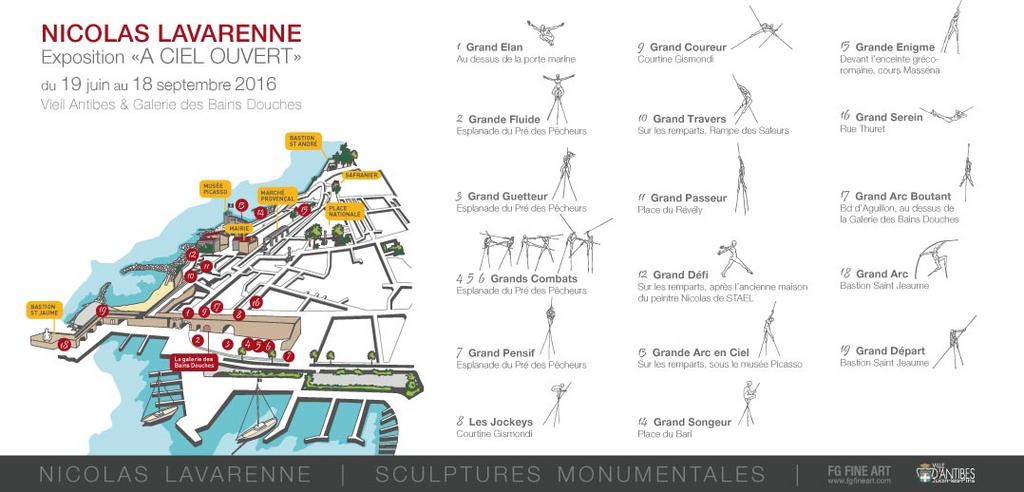 Keywords: map L’exposition- « A CIEL OUVERT » - ANTIBES 2016 Antibes nous fait lever les yeux au ciel cet été en mettant à l’honneur l’artiste Nicolas Lavarenne, 18 ans après “Sculptures sous le soleil d’Antibes”, dont il fût le lauréat en 1998. Du 19 juin au 18 septembre 2016, la vieille ville d’Antibes sera envahie de 19 sculptures monumentales de Nicolas Lavarenne. Surplombant la mer depuis les remparts, suspendus entre deux rues, viellant sur la ville depuis la porte marine, ou encore combattant sur l’esplanade du Pré aux Pêcheurs, nul doute que les êtres de bronze sculptés par Nicolas Lavarenne, perchés sur leurs échasses, sauront mettre en mouvement le paysage antibois en redéfinissant les contours et les espaces. “Les tiges font danser les pièces. Elles sont en bronze, mais deviennent alors légères”, raconte l’artiste. “Ma recherche m’a amené à des sculptures en bronze, aériennes, comme ”envolées” par des systèmes à base de tripodes, d’échasses, de tiges ou de hampes qui les propulsent vers le ciel, sorte de lignes de force, de lignes à haute tension, fulgurantes, vigoureuses, rigoureuses. Elles contrastent singulièrement avec la complexité noueuse, quasi baroque, du corps humain dont chaque élément anatomique est variable à l’infini au gré des morphologies et de la gestuelle “. Les sculptures de Nicolas Lavarenne sont réalisées avec la plus évidente minutie. Le détail est là, mais ce n’est pas lui que l’on retient, c’est son prolongement... commissaire d’exposition, Guillaume FURET www.SpArtSgallery.com L’exposition- « A CIEL OUVERT » - ANTIBES 2016 Antibes nous fait lever les yeux au ciel cet été en mettant à l’honneur l’artiste Nicolas Lavarenne, 18 ans après “Sculptures sous le soleil d’Antibes”, dont il fût le lauréat en 1998. Du 19 juin au 18 septembre 2016, la vieille ville d’Antibes sera envahie de 19 sculptures monumentales de Nicolas Lavarenne. Surplombant la mer depuis les remparts, suspendus entre deux rues, viellant sur la ville depuis la porte marine, ou encore combattant sur l’esplanade du Pré aux Pêcheurs, nul doute que les êtres de bronze sculptés par Nicolas Lavarenne, perchés sur leurs échasses, sauront mettre en mouvement le paysage antibois en redéfinissant les contours et les espaces. “Les tiges font danser les pièces. Elles sont en bronze, mais deviennent alors légères”, raconte l’artiste. “Ma recherche m’a amené à des sculptures en bronze, aériennes, comme ”envolées” par des systèmes à base de tripodes, d’échasses, de tiges ou de hampes qui les propulsent vers le ciel, sorte de lignes de force, de lignes à haute tension, fulgurantes, vigoureuses, rigoureuses. Elles contrastent singulièrement avec la complexité noueuse, quasi baroque, du corps humain dont chaque élément anatomique est variable à l’infini au gré des morphologies et de la gestuelle “. Les sculptures de Nicolas Lavarenne sont réalisées avec la plus évidente minutie. Le détail est là, mais ce n’est pas lui que l’on retient, c’est son prolongement... commissaire d’exposition, Guillaume FURET www.SpArtSgallery.com |