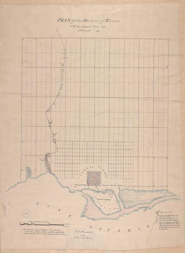 | Keywords: Plan of the harbour of Toronto with the proposed town and settlement.jpg York Upper Canada now Toronto This document was prepared five years before clearing of land and settlement began The plan was executed by John Graves Simcoe who in 1788 was a Major General The document illustrates the lot system that was to be implemented for York County Also shown is a potential site for the defense of the harbour indicated with a red 'A' Copied from a plan of Mr Collins it does not agree with the survey made by L Kotte in 1783 Plan 1 24 Engr D R Kotte's survey agrees with one taken in 1793 by J Bouchette Chateau In Lord Dorchester's No 48 to major Genl Simcoe Includes explanation The lots round the common are called town parks The lots beyone are farm lots A A A reserved lots for public purposes A on map refers to situation in Capt Mann's report of the 6th December 1788 as appearing proper to be occupied for the defence of the entrance of the harbour TPL http //www torontopubliclibrary ca/detail jsp Entt RDMDC-MAPS-R-4 R DC-MAPS-R-4 Plan of the harbour of Toronto with the proposed town and settlement at the Toronto Public Library John Collins 1788 Old maps of Toronto 1788 maps of Canada PD-old-100 |