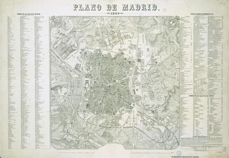 | Keywords: Plano de Madrid en 1866.jpg es Plano de Madrid levantado a expensas del Excmo Ayuntamiento desde 1841 a 1846 por los ingenieros de caminos D Juan Merlo D Fernando Gutierrez y D Juan Ribera ; la rectificación interior el aumento exterior y el dibujo han sido hechos por D José Pilar Morales ; Pedro Peñas grabó 1866 http //bdh bne es/bnesearch/detalle/89487 Biblioteca Nacional de España Morales José Pilar<br /> Peñas Pedro<br /> Merlo Juan<br /> Gutiérrez Fernando<br /> Ribera Juan de<br /> Litografía de N González Madrid Custom license marker 2013 11 20 PD-old-80 Spain 1866 Uploaded with UploadWizard Old maps of Madrid |