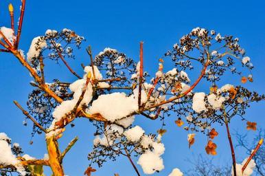 Keywords: plant winter snow covered nature tree branches spring buds burgeons blue sky