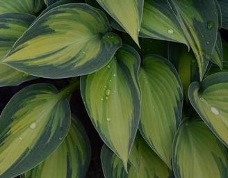 Keywords: plantain lily hosta wide brim green leaf leaves plant droplet water raindrops variegated