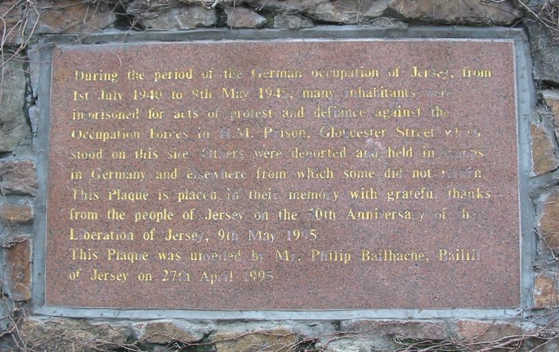 Keywords: Plaque prison German occupation Jersey.jpg During the period of the German occupation of Jersey from 1st July 1940 to 9th May 1945 many inhabitants were imprisoned for acts of protest and defiance against the Occupation Forces in H M Prison Gloucester Street which stood on this site Others were deported and held in camps in Germany and elsewhere from which some did not return This Plaque is placed in their memory with grateful thanks from the people of Jersey on the 50th Anniversary of the Liberation of Jersey 9th May 1995 This Plaque was unveiled by Mr Philip Bailhache Bailiff of Jersey on 27th April 1995 2006-02-26 own assumed Man vyi War memorials in Jersey Plaques referencing 1945 Plaques referencing 1940 Jersey in World War II Former prisons in Jersey Jersey resistance during World War II Plaques in Saint Helier Jersey 1995 in Jersey |