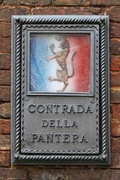 Keywords: Plaque territory Pantera Siena.jpg Plaque marking the territory the contrada della Pantera parish of the Panther piazza del Conte Siena Plaque marquant le territoire de la contrada dell'Aquila paroisse de la Panthère dans la piazza del Conte Sienne own Jastrow 2005 Public Domain Trademarked Palio di Siena Lions passant guardant in heraldry