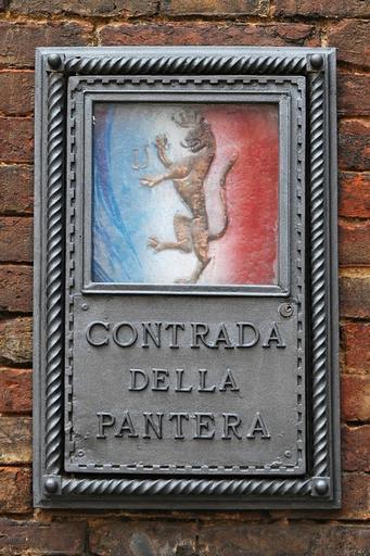 | Keywords: Plaque territory Pantera Siena.jpg Plaque marking the territory the contrada della Pantera parish of the Panther piazza del Conte Siena Plaque marquant le territoire de la contrada dell'Aquila paroisse de la Panthère dans la piazza del Conte Sienne own Jastrow 2005 Public Domain Trademarked Palio di Siena Lions passant guardant in heraldry |