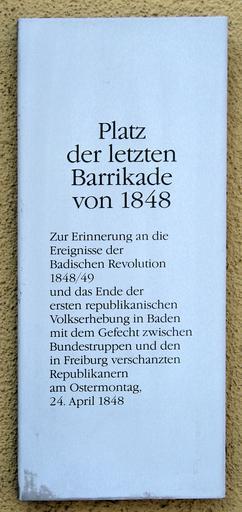 | Keywords: Platz der letzten Barrikade.JPG Square of the last barricade during the 1848 Revolution near the Schwabentor Source self-made Date 18 01 2008 Author Manfredjohannes 2007-04-02 own assumed Manfredjohannes 47 59 34 44 N 7 51 14 52 E scale 781_type landmark_region DE History of Freiburg im Breisgau 1848 |