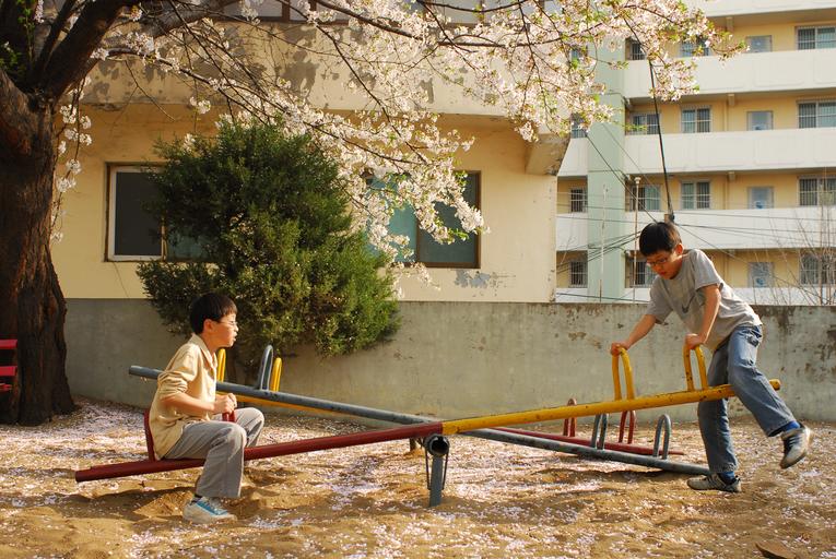 Keywords: playground children cherry blossom spring apartments