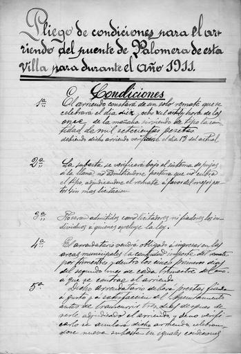 | Keywords: Pliego de condiciones para el arriendo del puente de Palomera.jpg ca Fins al començament del segle XX per accedir al poble de Llavorsí calia pagar un peatge al pont de la Palomera sobre el riu Noguera Pallaresa El peatge funcionà fins el 1921 1911 http //xac gencat cat/web/ content/xac/01_continguts_arxius_comarcals/ac_pallars_sobira/03_documents_escollits_acps/imatges/fitxers/pontatge1 jpg author other versions PD-old-70-1923 1911 texts Historical documents of Catalonia Llavorsí Uploaded with UploadWizard |