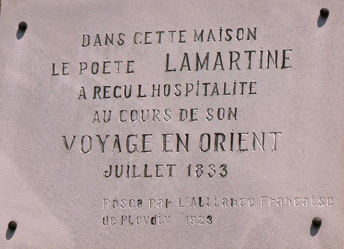 Keywords: Plovdiv-Lamartine-house-plaque.jpg Плочата на Лама тиновата къща в Пловдив където Алфонс дьо Лама тин отсяда за 3 дни п ез 1833 година по пътя си към О иента The plaque on the Lamartine House in Plovdiv Bulgaria where Alphonse de Lamartine stayed for 3 days in 1833 on his way to the Orient own 2008-06-01 Vassia Atanassova - Spiritia Lamartine House Plovdiv Plaques in Plovdiv |