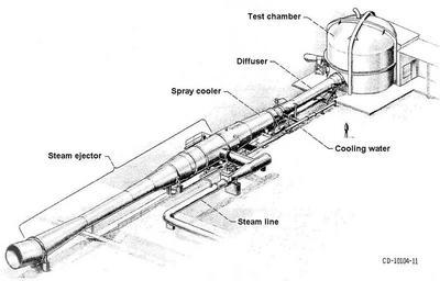 | Keywords: blackandwhite monochrome drawing text sketch black and white (CD-10104-11): This drawing details the 150-foot-long diffuser, cooler, and steam ejector assembly that exhausts the HTF’s test gas while simulating altitudes as high as 120,000 feet in the test chamber. Steam is supplied by one of the center’s boiler houses through a 30-inch pipe. (CD-10104-11): This drawing details the 150-foot-long diffuser, cooler, and steam ejector assembly that exhausts the HTF’s test gas while simulating altitudes as high as 120,000 feet in the test chamber. Steam is supplied by one of the center’s boiler houses through a 30-inch pipe. |