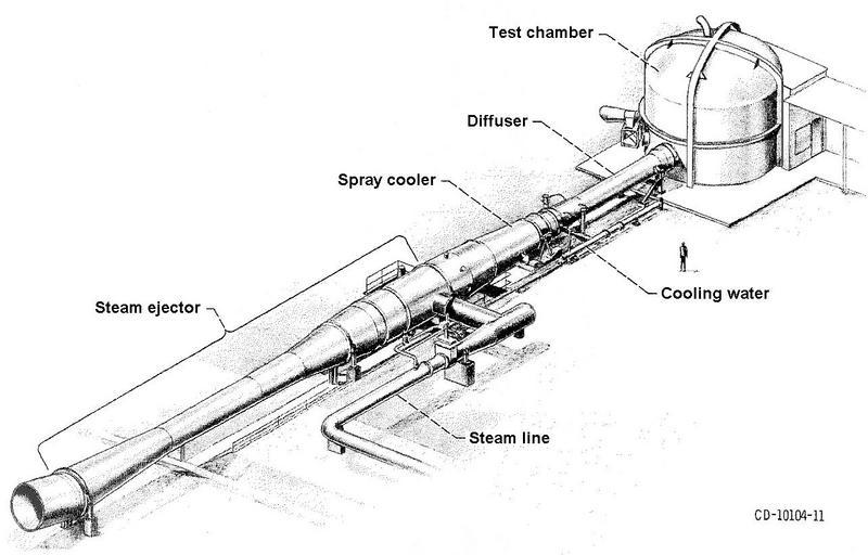 Keywords: blackandwhite monochrome drawing text sketch black and white (CD-10104-11): This drawing details the 150-foot-long diffuser, cooler, and steam ejector assembly that exhausts the HTF’s test gas while simulating altitudes as high as 120,000 feet in the test chamber. Steam is supplied by one of the center’s boiler houses through a 30-inch pipe. (CD-10104-11): This drawing details the 150-foot-long diffuser, cooler, and steam ejector assembly that exhausts the HTF’s test gas while simulating altitudes as high as 120,000 feet in the test chamber. Steam is supplied by one of the center’s boiler houses through a 30-inch pipe. |