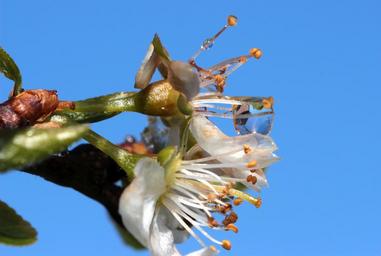 Keywords: plum tree prunus domestica plum blossom spring flowering stems bloom raindrop wet spieglung reflection