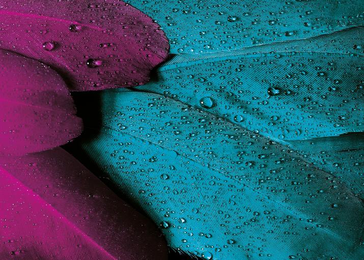 Keywords: plumage feather bird pink violet turquoise drop of water water repellent protection glory dress scapulars spring tree striking colored background fund scan from the slide