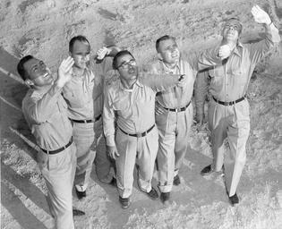 | Keywords: Plumbbob John 006.jpg en Original caption <blockquote>LAS VEGAS NV JULY 18 1957 -- Five Air Force officers will be observers at Ground Zero during the explosion of the first air-to live atomic rocket ever fixed from a manned aircraft when they stand directly under the shot scheduled for early Friday morning at the Nevada Test Site The officers all members of the Continental Air Defense Command and based in Colorado Springs CO will stand directly under the burst sans helmets hats caps goggles or protective clothing to illustrate that the civil populace need fear no harmful effects were it necessary to use the atomic rocket in a tactical situation </blockquote> 409 PLU-57-031 Federal Government of the United States 1957-07-18 PD-USGov Plumbbob John Black and white group photographs of men Group photographs of military people |