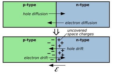 Keywords: Pn Junction Diffusion and Drift.svg Diagram of the diffusion across a pn junction with the resultant uncovered space charges the electric field and the drift currents own Own Drawing 2007-02-20 Inductiveload PN-junction diagrams