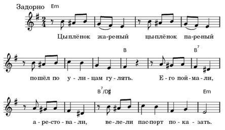 | Keywords: Цыплёнок жареный.png Цыплёнок жа еный Цыплёнок жа еный own work in LilyPond based on http //a-pesni golosa info/dvor/cyplenok gif Music and lyrics are folk art / мелодия и слова на одное тво чество ~ 1918 public domain see below PD-RU-exempt Source code LilyPond source code used to create this file <pre> \version 2 12 2 << \new ChordNames \override ChordName 'font-size -1 \chordmode 0 e8 m r8 r4 r2 r2 r2 4 r2 r2 r2 b4 r4 8 r2 b4 7 r4 r2 r2 12 b8 7/dis r8 r4 r2 r2 e2 m \relative c' \mark Задо но \time 2/4 \key g \major 0 r8 b' ais b g fis e4 r8 b' ais b g fis e4 4 r8 b' ais b c4 b4 g4 e4 fis4 r4 8 r8 a gis a fis4 dis4 r8 a' gis a fis4 dis4 12 r8 b' ais b c4 b4 fis4 g4 e2 \addlyrics 0 Цы -- плё -- нок жа- е -- ный цы -- плё -- нок па- е -- ный 4 по -- шёл по у -- ли -- цам гу -- лять 8 Е -- го пой -- ма -- ли а -- е -- сто -- ва -- ли 12 ве -- ле -- ли пас -- по т по -- ка -- зать >> \layout \context \Score \remove Bar_number_engraver \override SpacingSpanner 'base-shortest-duration ly make-moment 1 20 \context \Lyrics \override LyricSpace 'minimum-distance 1 0 line-width 150 </pre> Sheet music Songs of Russia |
