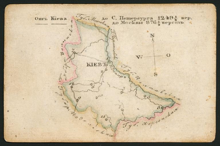| Keywords: Карта Киевской губернии.png ru Иг альная ка та с изоб ажение Киевской губе нии ачало XIX века en This early-19th century playing card is from a set of 60 such cards each devoted to a different province or territory of the Russian Empire which at the time included the Grand Duchy of Finland Congress Poland and Russian America One side of each card shows the local costume and the provincial coat of arms; the other side contains a map This card depicts Kiev Province part of present-day Ukraine Kiev Kyiv in Ukrainian situated on the Dnieper Dnipro in Ukrainian River was the capital of Kievan Rus' in the 10th-12th centuries Kiev was the administrative center of the province and is the capital of present-day Ukraine The card indicates that the distance from Kiev to St Petersburg was 1 249¼ versts and from Kiev to Moscow 876¾ versts A verst is a Russian measurement of distance no longer used equal to 1 0668 kilometers XIX c http //www wdl org/ru/item/4497/ Г ибанов К PD-old-100 Uploaded with UploadWizard Maps of Kiev Governorate Images from the World Digital Library Russian National Library collection |