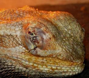Keywords: Pogona vitticeps after an eye operation.JPG en Pogona vitticeps after an eye operation showing stitches and antibiotic cream own photo HTO 2012-06-04 Pogona vitticeps heads Veterinary surgery Eye surgery