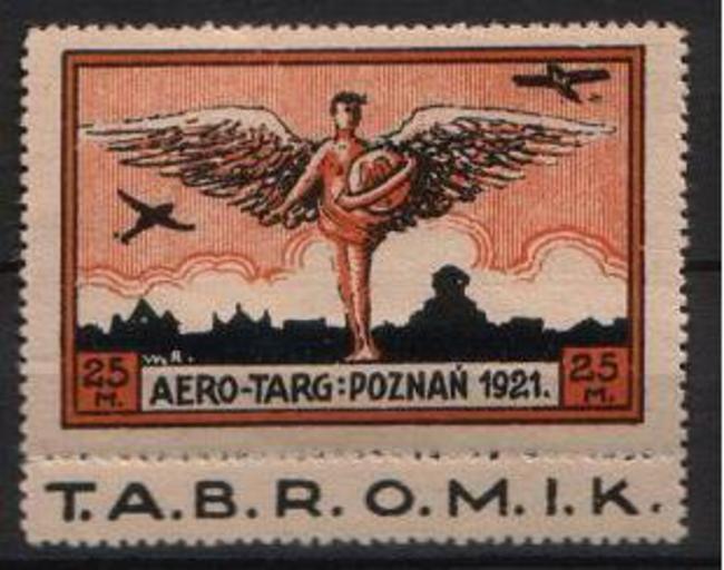 | Keywords: Poland 1921 Aero-Targ I.JPG Aero-Targ Company in agreement with the Polish Ministry of Post Telegraph Aero-Targ stamps had to be bought for airmail in addition to the normal express postage rate payable by usage of regular Polish stamps The stamp was designed by Wilhelm Rudy initials W R on the stamps and crudely lithographed Perforated 11 25 but also known imperforated This 25mk value shows Icarus against Poznan Attached to each stamp was an advertising label inscribed T A B R O M I K for vodka factory TAdeusz BROnislaw MIKołajczyk Forged stamps are known The first flights from Poznan to Gdansk and to Warsaw were on 29 May 1921 The first return flight from Warsaw to Poznan was on 31 May 1921 There were daily return flights until 16 June 1921 A special winged postmark was used from May 29 thru 16 June 1921 at the Poznan Fair Flights Postmarks with dates after 16 June 1921 are fake 1921 Scan of original Aero-Targ Company PD-old Stamps of Poland 1921 Airmail stamps Orange stamps History of Poznań Economy of Gniezno |