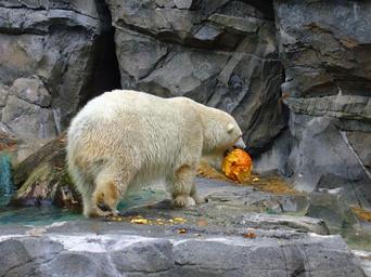Keywords: polar bear zoo animal wildlife carnivore eating pumpkin ursus maritimus bear white nature wild mammal