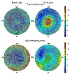 | Keywords: Polar Maps of Thermal and Epithermal Neutrons DVIDS681826.jpg en Observations by NASA's 2001 Mars Odyssey spacecraft show views of the polar regions of Mars in thermal neutrons top and epithermal neutrons bottom In these maps deep blue indicates a low amount of neutrons and red indicates a high amount Thermal neutrons are sensitive to the presence of hydrogen and the presence of carbon dioxide in this case dry ice frost The red area in the upper right map indicates that about one meter three feet of carbon dioxide frost covers the surface around the north pole as it does every Mars winter in the polar regions An enhancement of thermal neutrons close to the south pole seen as a light green color on the upper left map indicates the presence of residual carbon dioxide in the south polar cap even though the annual frost dissipated from that region during southern summer Soil enriched with hydrogen is indicated by the deep blue colors on the epithermal maps bottom showing a low intensity of epithermal neutrons The deep blue areas in the polar regions are believed to contain up to 50 percent water ice in the upper one meter three feet of the soil The views shown here are of measurements made during the first three months of mapping using the neutron spectrometer instrument part of the gamma ray spectrometer instrument suite Topographic features are superimposed on the map for geographic reference NASA's Jet Propulsion Laboratory manages the 2001 Mars Odyssey mission for NASA's Office of Space Science Washington D C Investigators at Arizona State University in Tempe the University of Arizona in Tucson and NASA's Johnson Space Center Houston operate the science instruments The gamma-ray spectrometer was provided by the University of Arizona in collaboration with the Russian Aviation and Space Agency which provided the high-energy neutron detector and the Los Alamos National Laboratories New Mexico which provided the neutron spectrometer Lockheed Martin Astronautics Denver is the prime contractor for the project and developed and built the orbiter Mission operations are conducted jointly from Lockheed Martin and from JPL a division of the California Institute of Technology in Pasadena NASA Identifier PLAN-PIA03802 2009-10-30 Glenn Research Center https //www dvidshub net/image/681826 681826 2012-10-10 10 24 WASHINGTON DC US PD-USGov Arizona State University Images from DoD uploaded by Fæ |