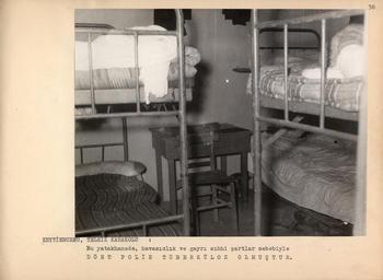 | Keywords: salt araştırma saltaraştırma salt research saltresearch salt online saltonline karakol binaları karakolbinaları i̇stanbul karakol binaları istanbulkarakolbinaları eski karakol binaları eskikarakolbinaları karakol zeytinburnu emniyet amirliği zeytinburnuemniyetamirliği karakol yatakhanesi karakolyatakhanesi emniyet müdürlüğü araştırma bürosu emniyetmüdürlüğüaraştırmabürosu police stations policestations istanbul police stations istanbulpolicestations old police stations oldpolicestations i̇stanbul istanbul 1962 zeytinburnu telsiz karakolu zeytinburnutelsizkarakolu photo border monochrome “Karakol binalarının köhneliği ve gayrı sıhhi durumunu gösterir birkaç misal: 1. Fatih Emniyet Amirliği, Karagümrük Merkezi, Kızıltoprak Merkezi binalarının maili inhidam olmaları ve bu durumları ile tehlike arz etmeleri sebebiyle mezkur merkezlerin amirleri, personellerini bu binaların yatakhanelerinde yatmaya icbar edememekte ve mes’uliyetten çekinmekteydiler. 2. Zeytinburnu Emniyet Amirliğine bağlı telsiz karakolu yatakhanesinde havasızlık sebebiyle hiçbir memur yatamamaktadır. Telsiz karakolunda daha evvelce vazife gören ve karakolda yatan memurlardan dört tanesi tüberküloz olmuştur. 3. Mevcut 53 ahşap karakolun damları kış aylarında akmaktadır ve bu karakollar normal bir şekilde ısıtılamadığı için personelleri devamlı olarak hastalıktan kurtulamamaktadır.” Kaynak: “İstanbul ve Polisi”, T.C. İstanbul Vilayeti Emniyet Müdürlüğü Araştırma Bürosu, 1962 SALT Araştırma, Fotoğraf Arşivi SALT Research, Photography Archive “Karakol binalarının köhneliği ve gayrı sıhhi durumunu gösterir birkaç misal: 1. Fatih Emniyet Amirliği, Karagümrük Merkezi, Kızıltoprak Merkezi binalarının maili inhidam olmaları ve bu durumları ile tehlike arz etmeleri sebebiyle mezkur merkezlerin amirleri, personellerini bu binaların yatakhanelerinde yatmaya icbar edememekte ve mes’uliyetten çekinmekteydiler. 2. Zeytinburnu Emniyet Amirliğine bağlı telsiz karakolu yatakhanesinde havasızlık sebebiyle hiçbir memur yatamamaktadır. Telsiz karakolunda daha evvelce vazife gören ve karakolda yatan memurlardan dört tanesi tüberküloz olmuştur. 3. Mevcut 53 ahşap karakolun damları kış aylarında akmaktadır ve bu karakollar normal bir şekilde ısıtılamadığı için personelleri devamlı olarak hastalıktan kurtulamamaktadır.” Kaynak: “İstanbul ve Polisi”, T.C. İstanbul Vilayeti Emniyet Müdürlüğü Araştırma Bürosu, 1962 SALT Araştırma, Fotoğraf Arşivi SALT Research, Photography Archive |