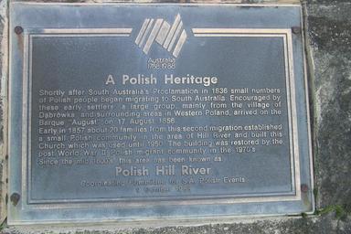 | Keywords: Polish Hill River commemorative plaque.jpg Wkrótce po powstaniu Australii PoÅ‚udniowej w 1836 do nowego stanu przybyÅ‚a grupa polskich emigrantów ZachÄ™ceni przez pierwszych pionierów 17 sierpnia 1856 do Australii przybyÅ‚a znacznie wiÄ™ksza grupa pochodzÄ…ca głównie z wioski DÄ…brówki z zachodniej Polsce Na poczÄ…tku 1857 grupa 20 rodzin osiedliÅ‚a siÄ™ w obszarze Hill River i zbudowaÅ‚a tu koÅ›ciół który byÅ‚ używany jeszcze do 1950r W latach 70 budynek ten zostaÅ‚ odnowiony przez emigrantów przybyÅ‚ych do Australii po II wojnie Å›wiatowej Od poÅ‚owy XIX wieku ten rejon jest znany jako Polish Hill River Transferred from http //pl wikipedia org pl wikipedia; transferred to Commons by User Pjahr using http //tools wikimedia de/~magnus/commonshelper php CommonsHelper 2005-07-21 Roo72 Original uploader was Roo72 at http //pl wikipedia org pl wikipedia Released into the public domain by the author pl wikipedia Roo72 original upload log page pl wikipedia PHR_tablica_pamiatkowa jpg 2005-07-21 04 56 Roo72 2592×1728× 1445859 bytes <nowiki>Wkrótce po powstaniu Australii Południowej w 1836 do nowego stanu przybyła grupa polskich emigrantów Zachęceni przez pierwszych pionierów 17 sierpnia 1856 do Australii przybyła znacznie większa grupa pochodząca głównie z wioski Dąbrówki z</nowiki> Polish Hill River Plaques in Clare Valley |