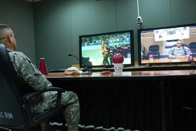 | Keywords: Pomp, circumstance around division DVIDS93402.jpg en Sgt Maj Fernando Garcia who resides in Killeen Texas and serves as the senior non-commissioned officer of logistics for Multi-National Division “ Baghdad and the 4th Infantry Division patiently waits to see his son Leonardo Garcia cross the stage during his graduation from Killeen High School The Garcia family was able to come together for this special event which took place during the early morning of June 9 in Iraq and the evening of June 8 in Texas through the use of video teleconference technology in the film room at the MND-B headquarters building and the Killeen Expo Center in Killeen Texas Garcia's eldest son was also able to view the event using a live internet feed from the Officer Basic Course in Fort Benning Georgia U S Army photo/Pfc Samantha Schutz 2008-06-09 https //www dvidshub net/image/93402 93402 2008-06-09 11 31 BAGHDAD IQ PD-USGov Fort Benning Images from DoD uploaded by Fæ |